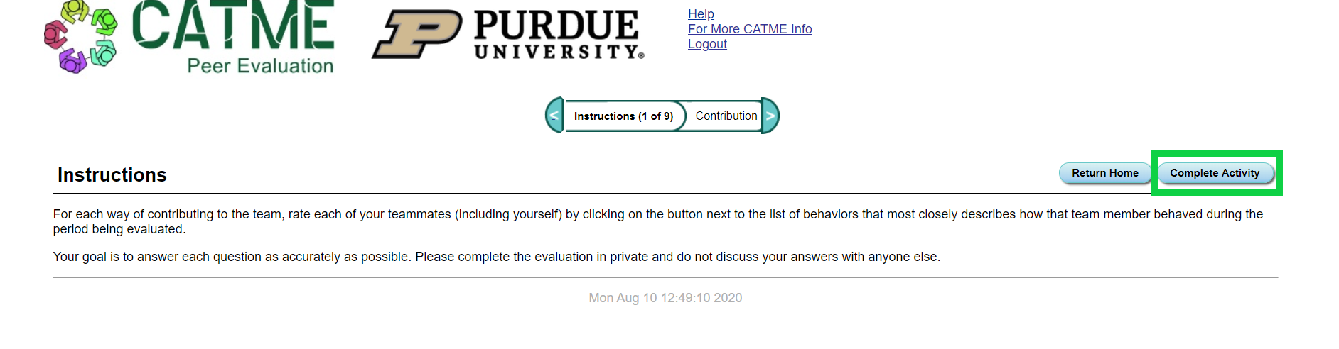 To take a peer-evaluation survey, go into your activity list, find the survey in your activity table and click "Complete Activity."