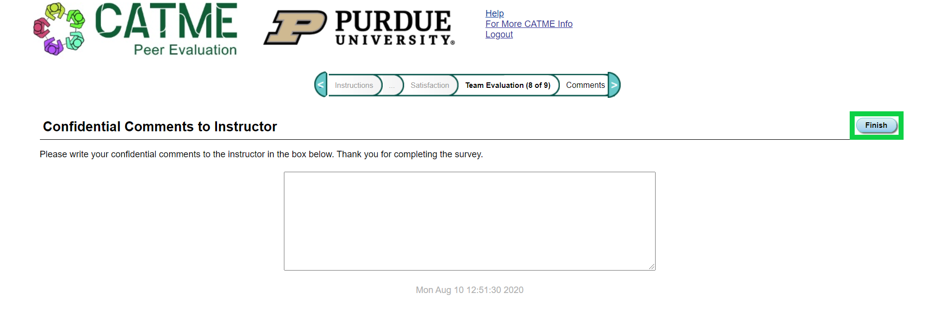 At the end of the survey, you can add comments to your instructor. When you are done with adding comments, click "Finish" to exit the survey.