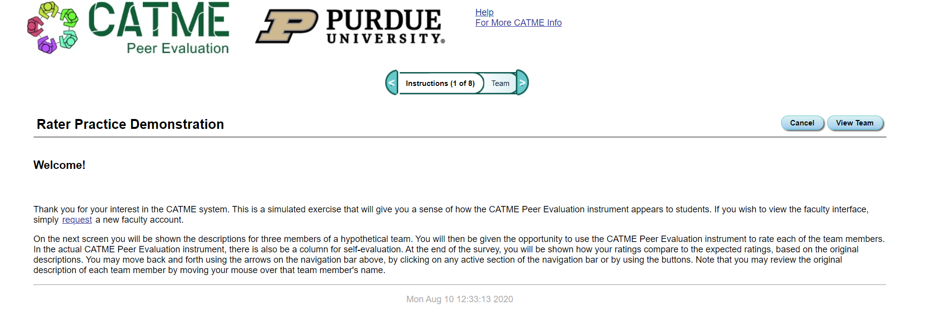 The CATME Rater Practice Program is a game-based rating simulation that provides you the opportunity to practice rating your peers. Your instructor might require you to do this practice before you start the actual survey.