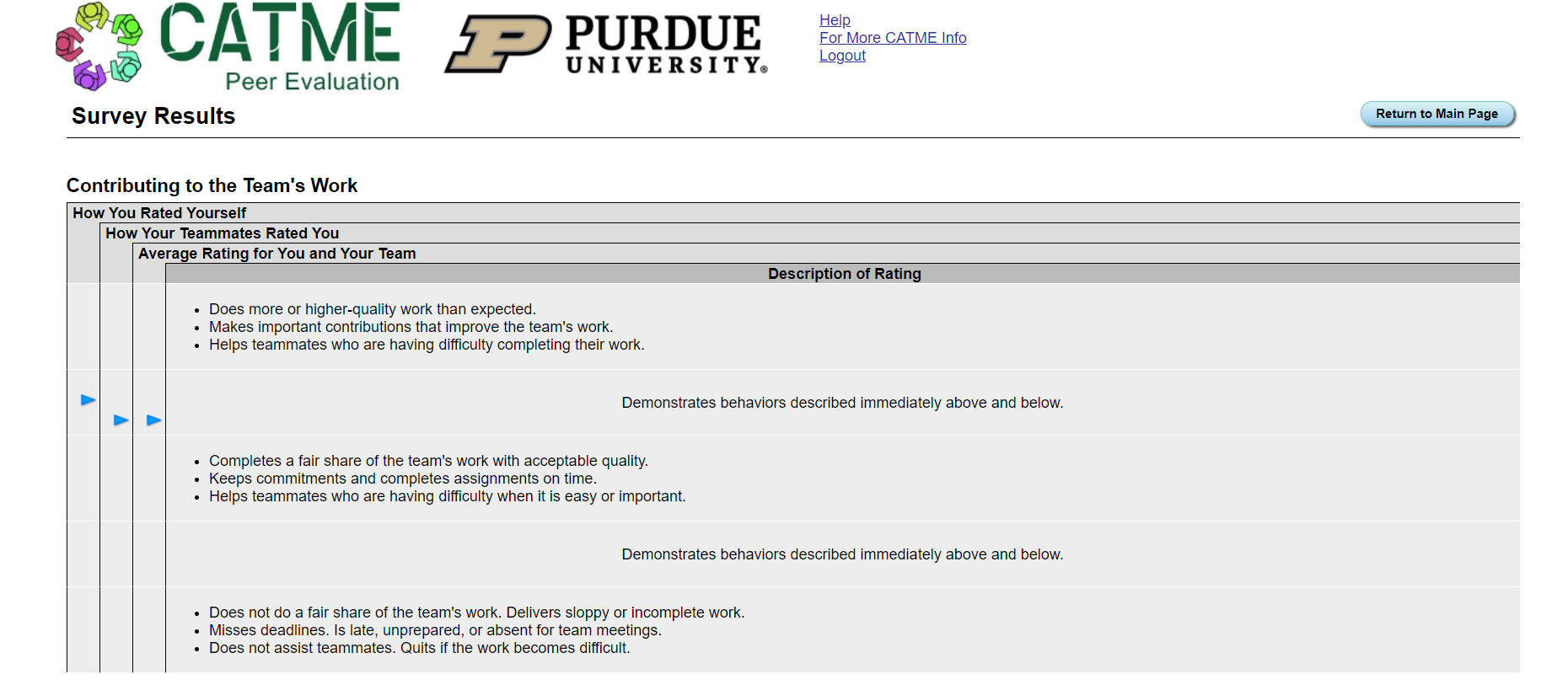 In the Peer-Evaluation survey, you will rate your peers on a scale from 1-5 for each category. The table below describes the appropriate ratings for team-mate behavior for each dimension.